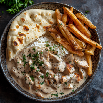 Creamy Chicken & turkey Bacon Stroganoff with Garlic Naan, Rice & Crispy Fries