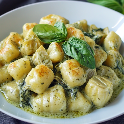 Creamy Pesto Gnocchi with Spinach and Artichokes