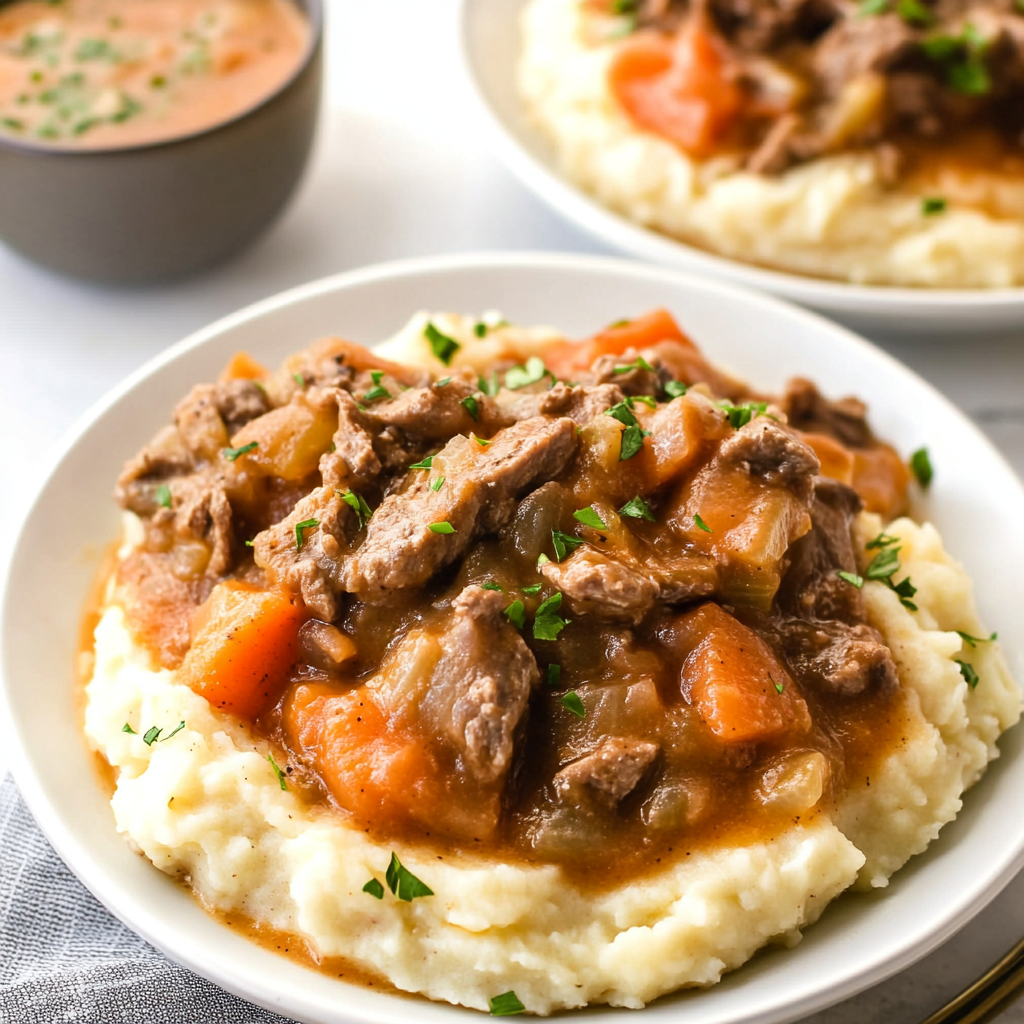 Fall Apple Cider Stew over Mashed Potatoes