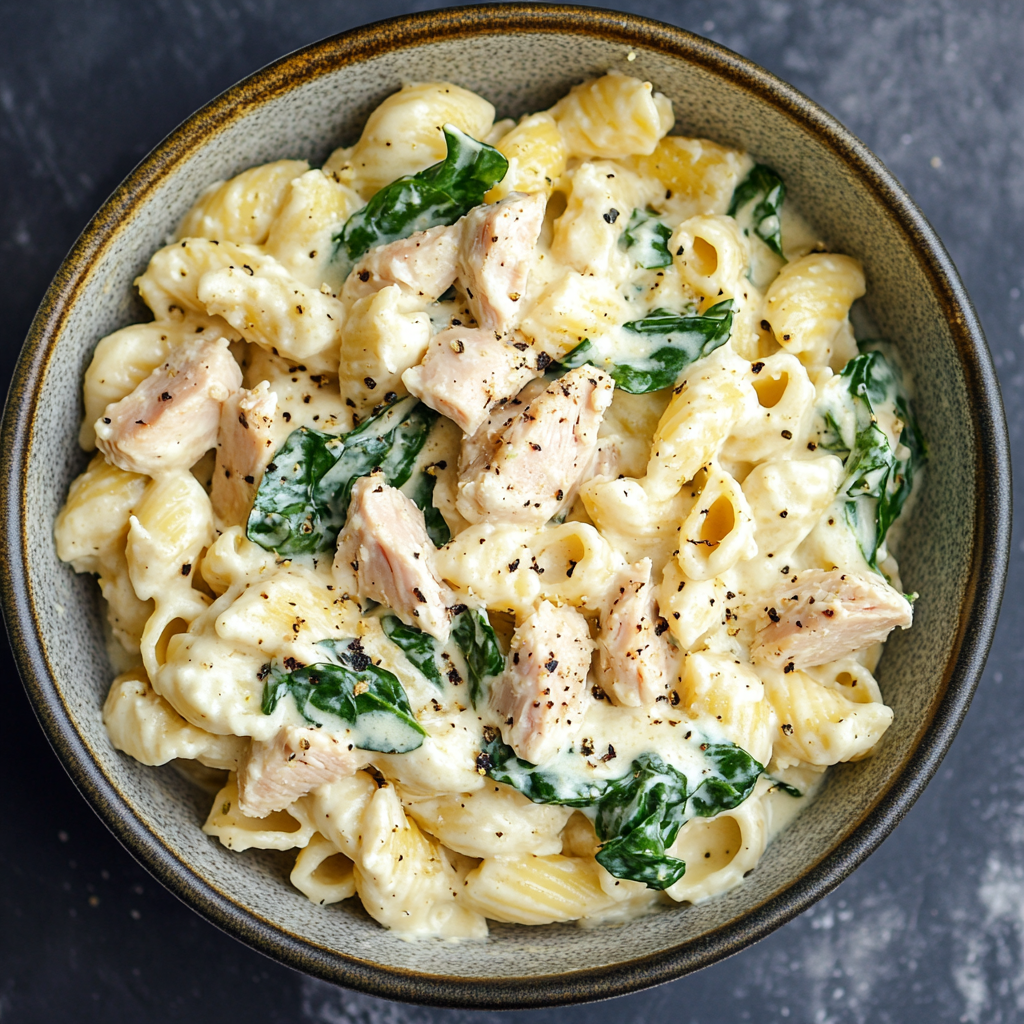 Creamy Chicken Pasta with turkey Bacon, Spinach & Cheese