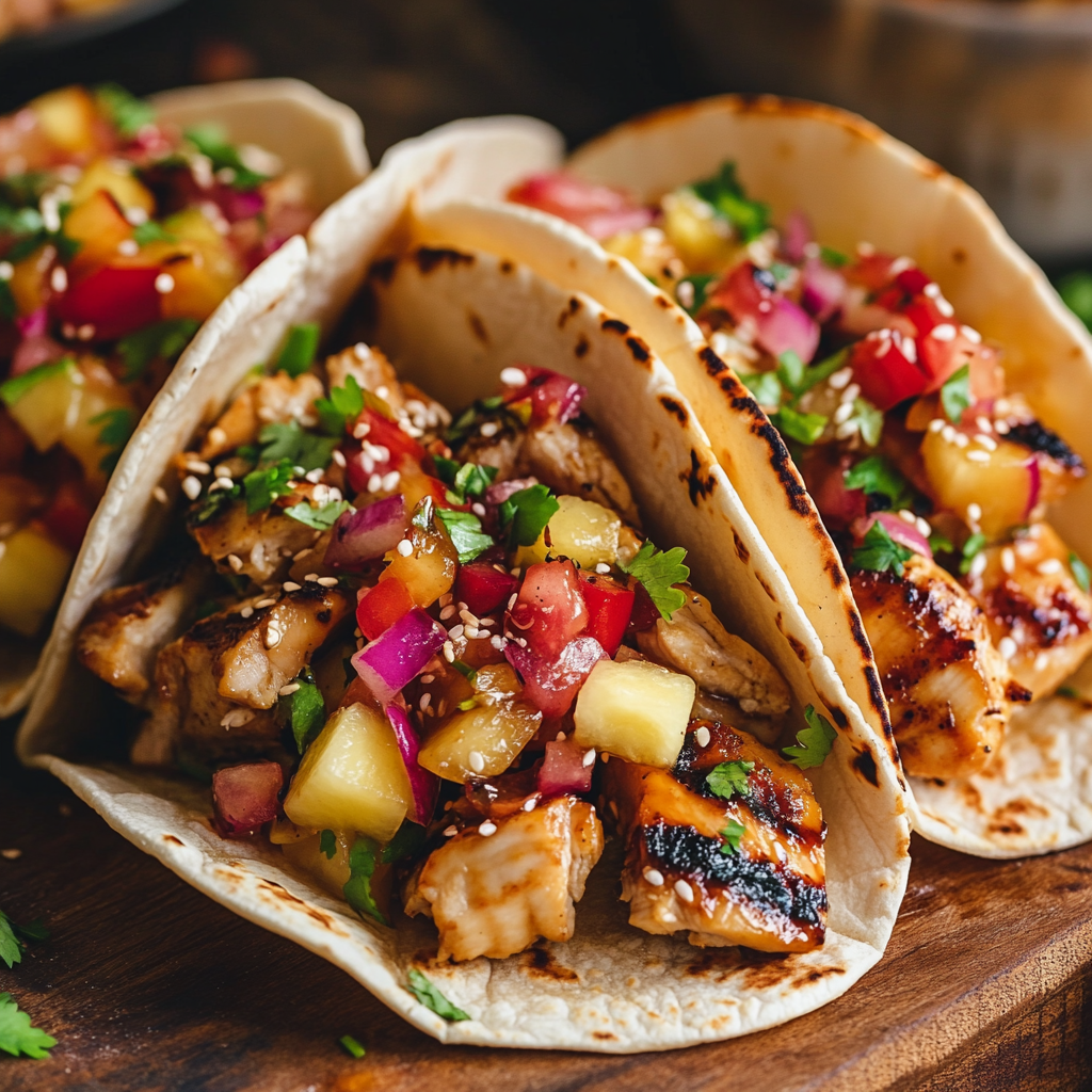 Teriyaki Chicken Tacos with Grilled Pineapple Pear Salsa